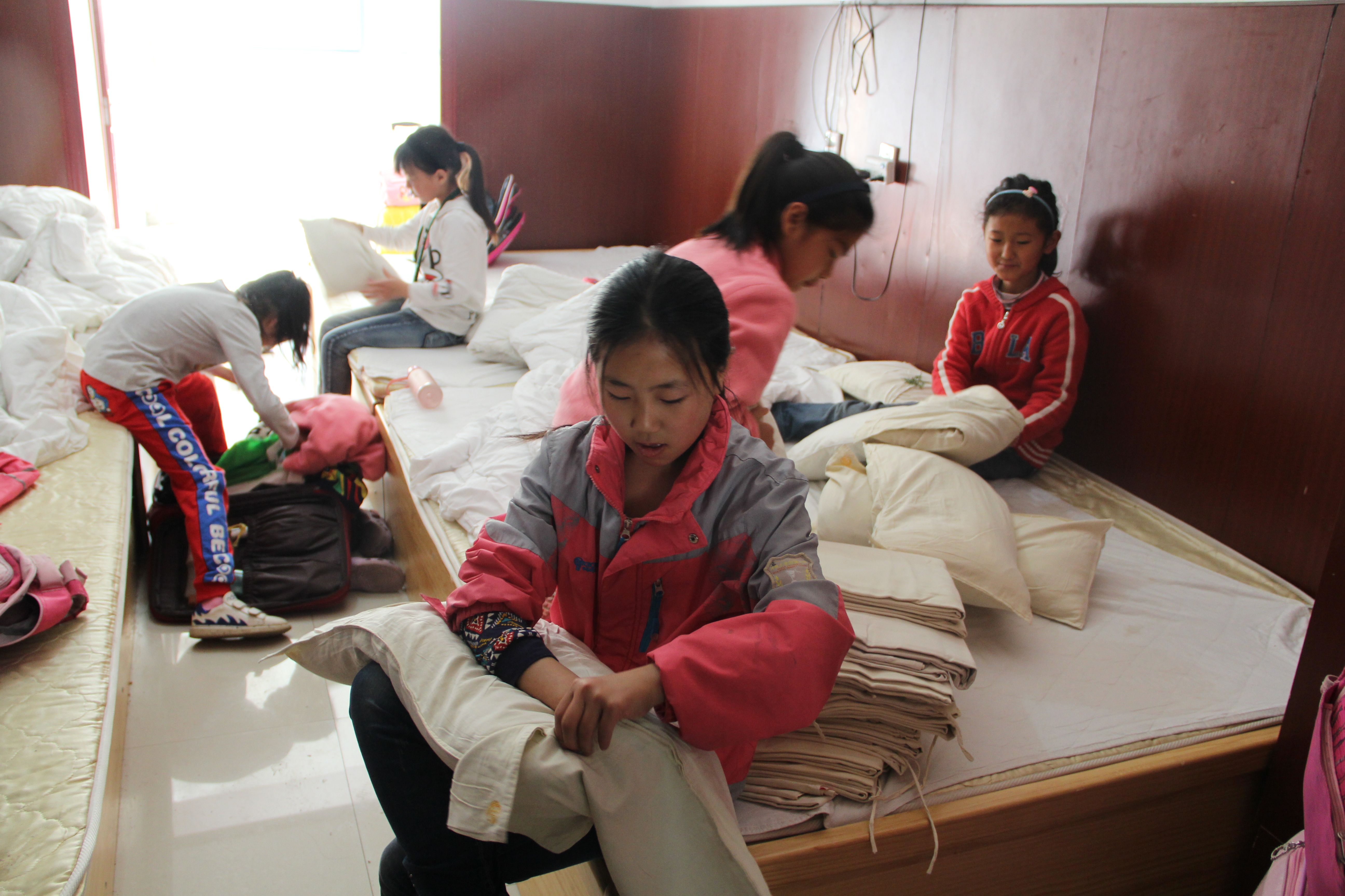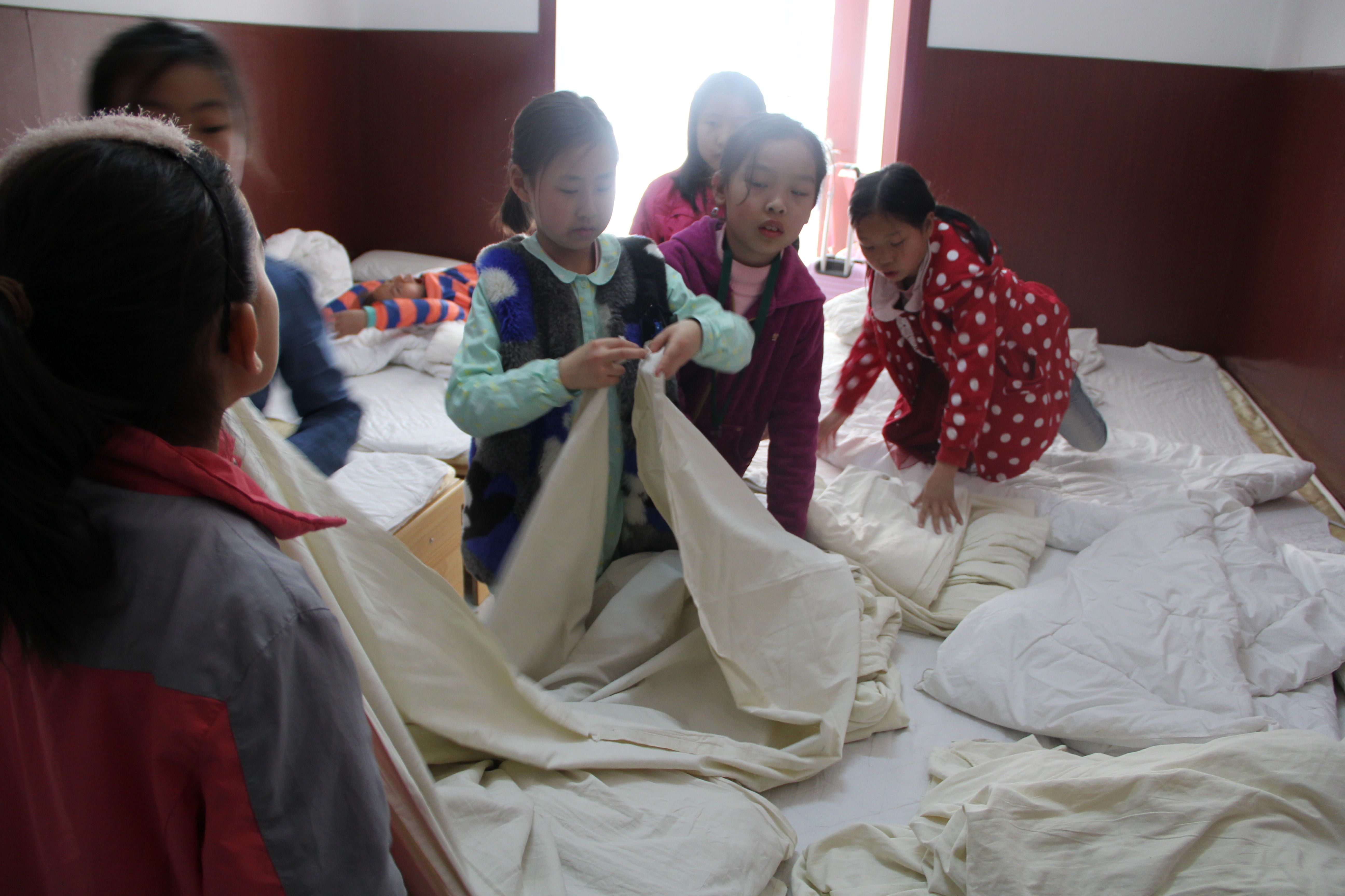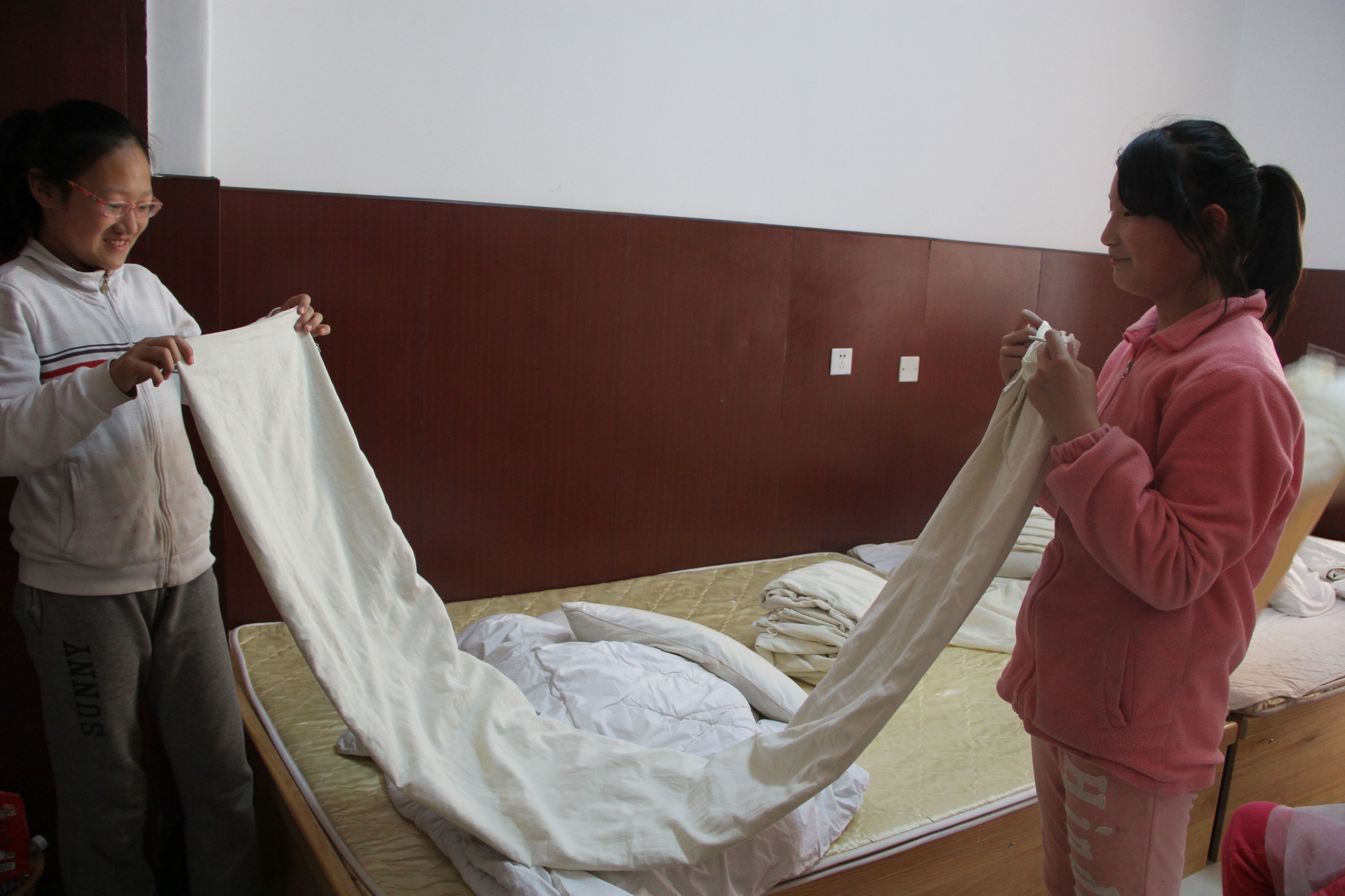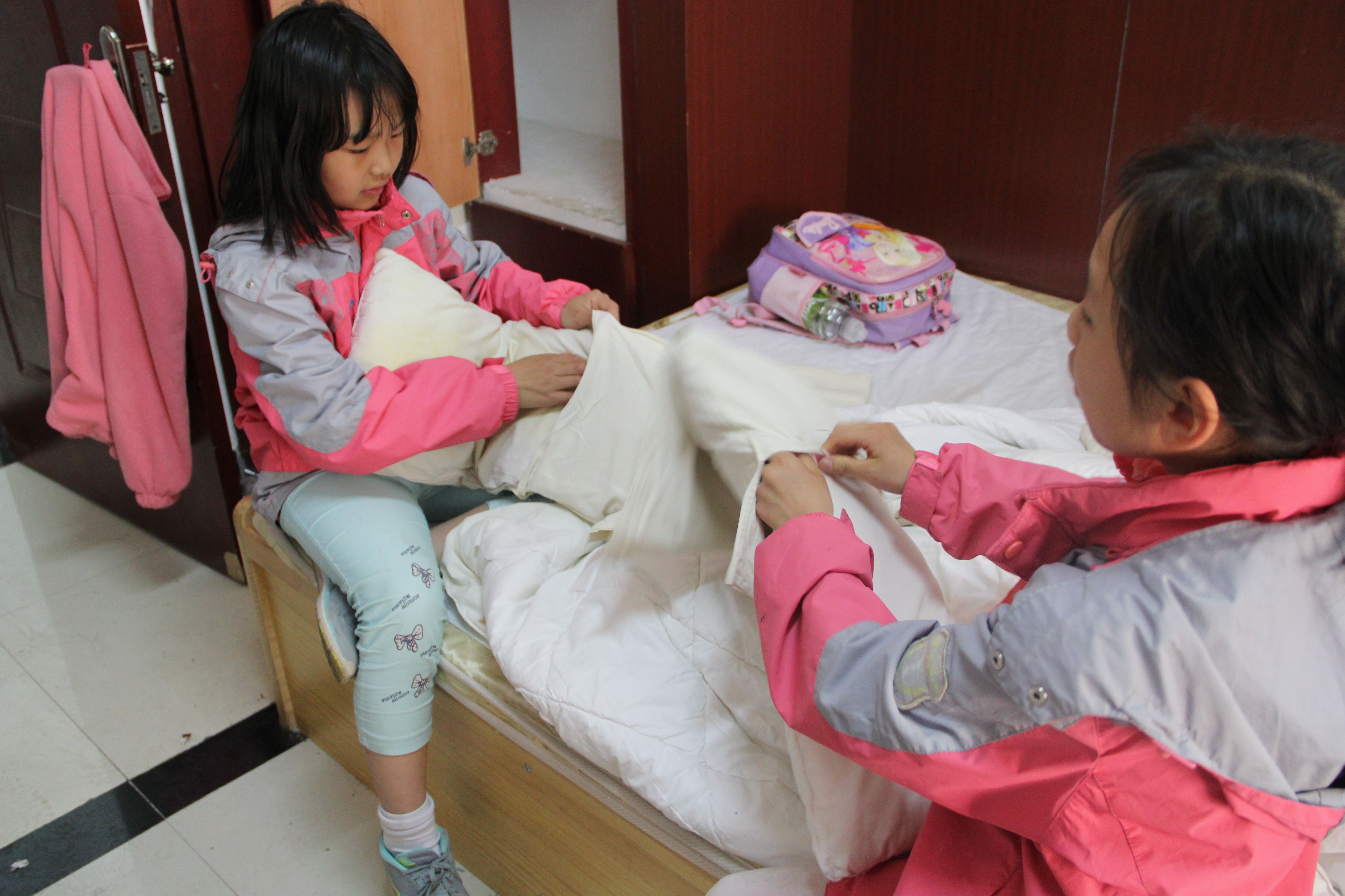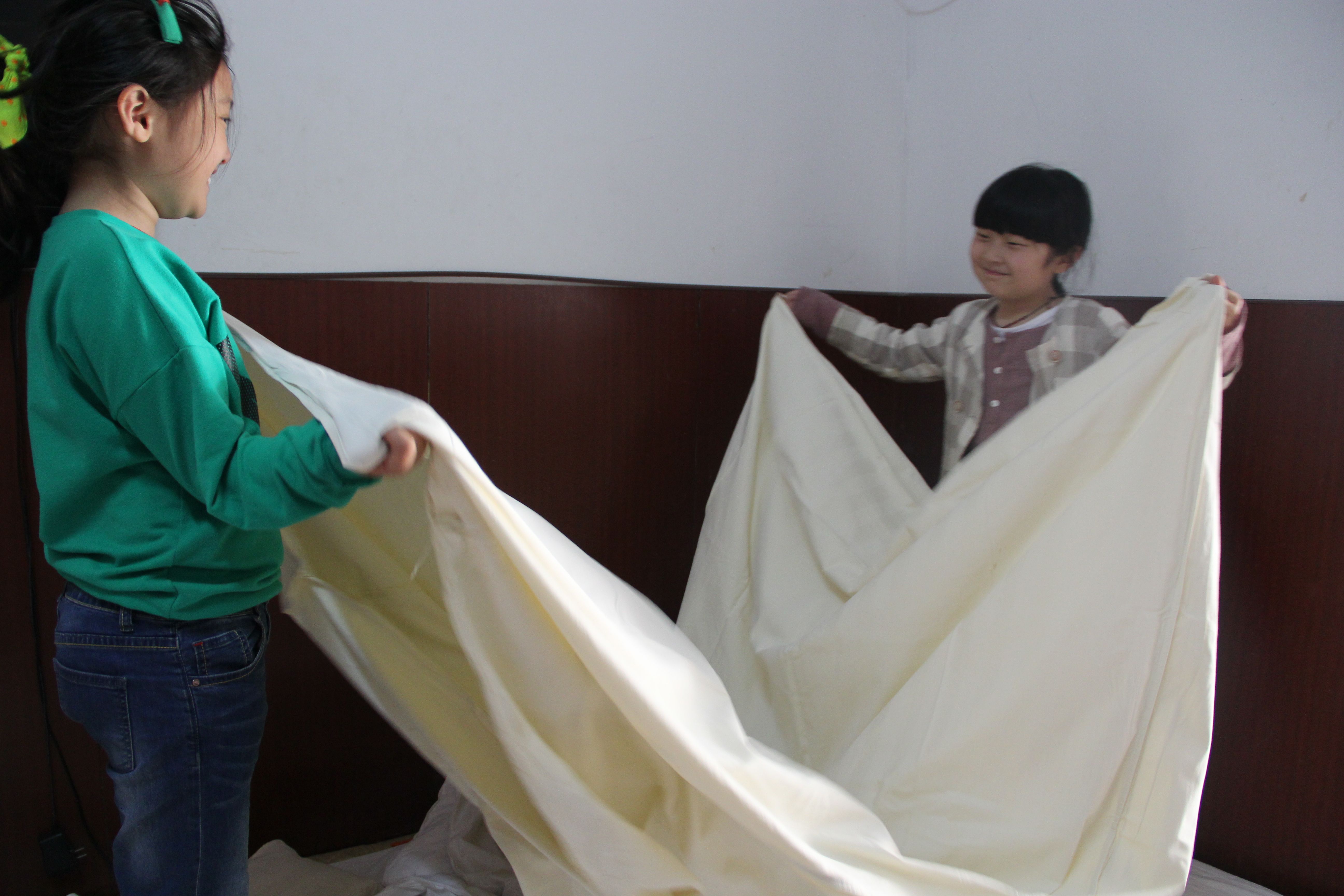 早餐后,同学们运用在基地学到的技能整理内务,大家分工协作,将床单、被罩、枕套拆下,排队交到基地工作人员手中,领取新的被罩、枕套,并认真套在被子、枕头上,铺好床,整理自己的行李,打扫宿舍卫生。
