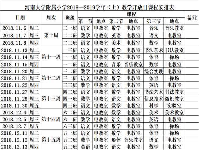 为了加强学校与家庭之间的联系,使家长更加深入地参与学校的各项教学活动,以进一步提高教学质量,河南大学附属小学于2018年11月6日到2018年12月13日分班举行教学开放日活动。具体安排如下: