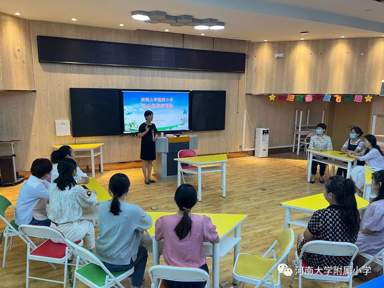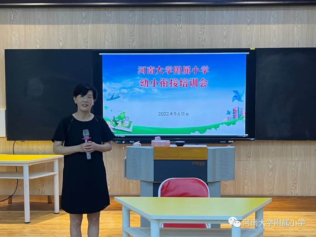 为全面推进幼小衔接工作,深入贯彻落实教育部《关于大力推进幼儿园与小学科学衔接的指导意见》《义务教育课程方案(2022年版)》等相关文件,9月11日,河南大学附属小学邀请河南大学幼儿园副园长闵益洁为我校一年级教师进行了一场以“玩游戏 减坡度”为主题的幼小衔接培训。