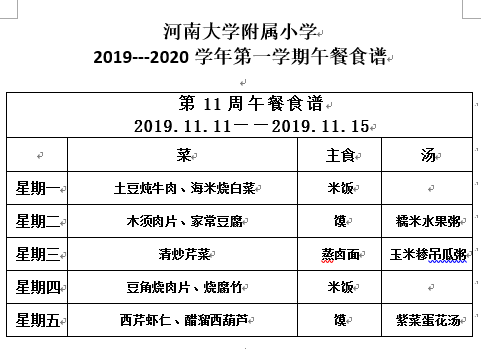 河南大学附属小学2019---2020学年第一学期第11周午餐食谱