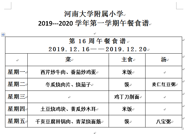 河南大学附属小学2019---2020学年第一学期第16周午餐食谱