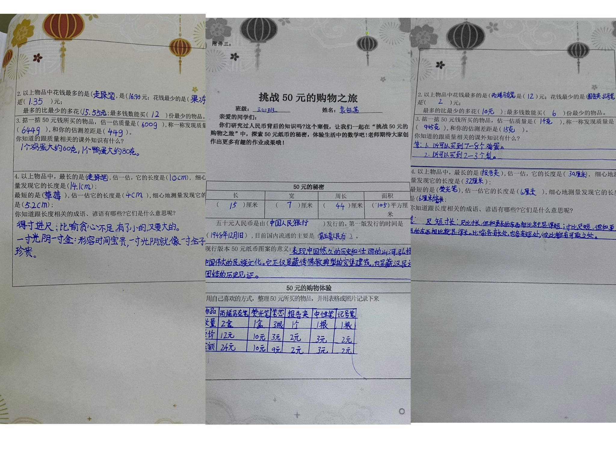 “挑战50元的购物之旅”的活动会让孩子们既把度量的知识串连成线,又能让学生了解人民币的历史和意义,其中的购物体验让孩子们去实际感受购物,又能在购物过程中融入数学知识,购买的商品又从不同的数学角度去分类。
